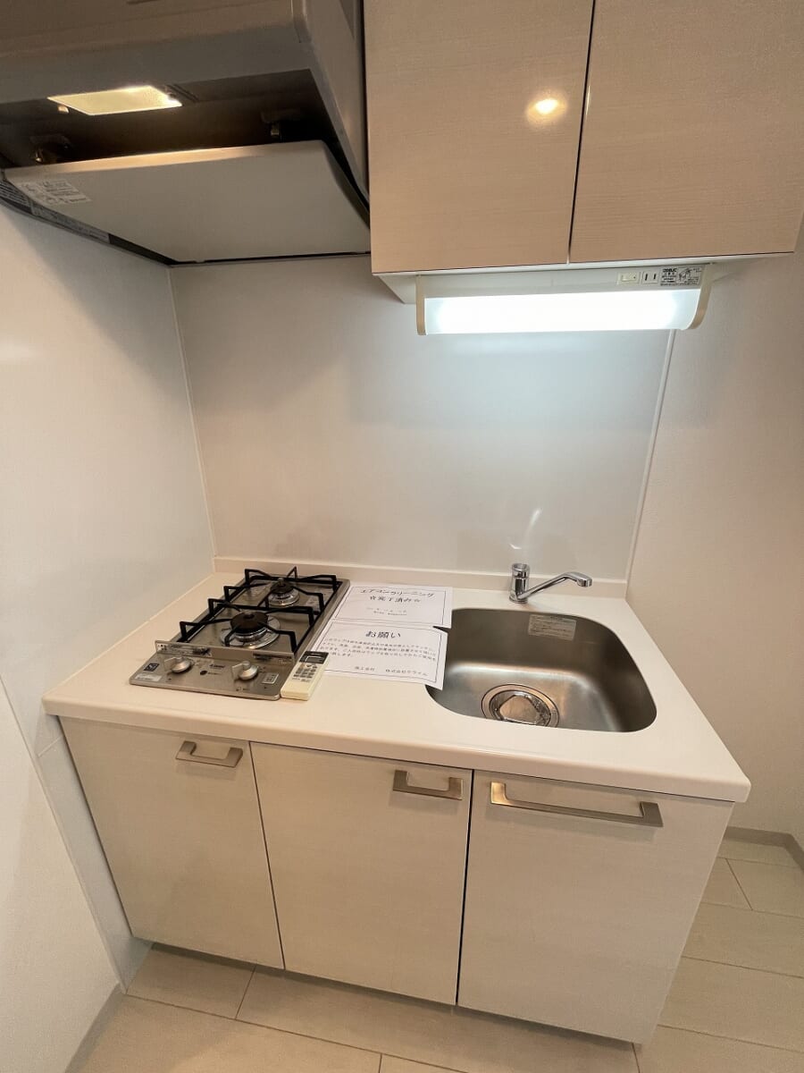 キッチンはコンパクトながら使い勝手を重視した設計で、縦型2口ガスコンロを完備。調理スペースも確保されており、自炊派の方にも嬉しい環境です。上下に収納スペースがあり、食器や調理器具を整理しやすく、作業効率が上がります。キッチン周りはお掃除も簡単で、常に清潔な状態を保てます。