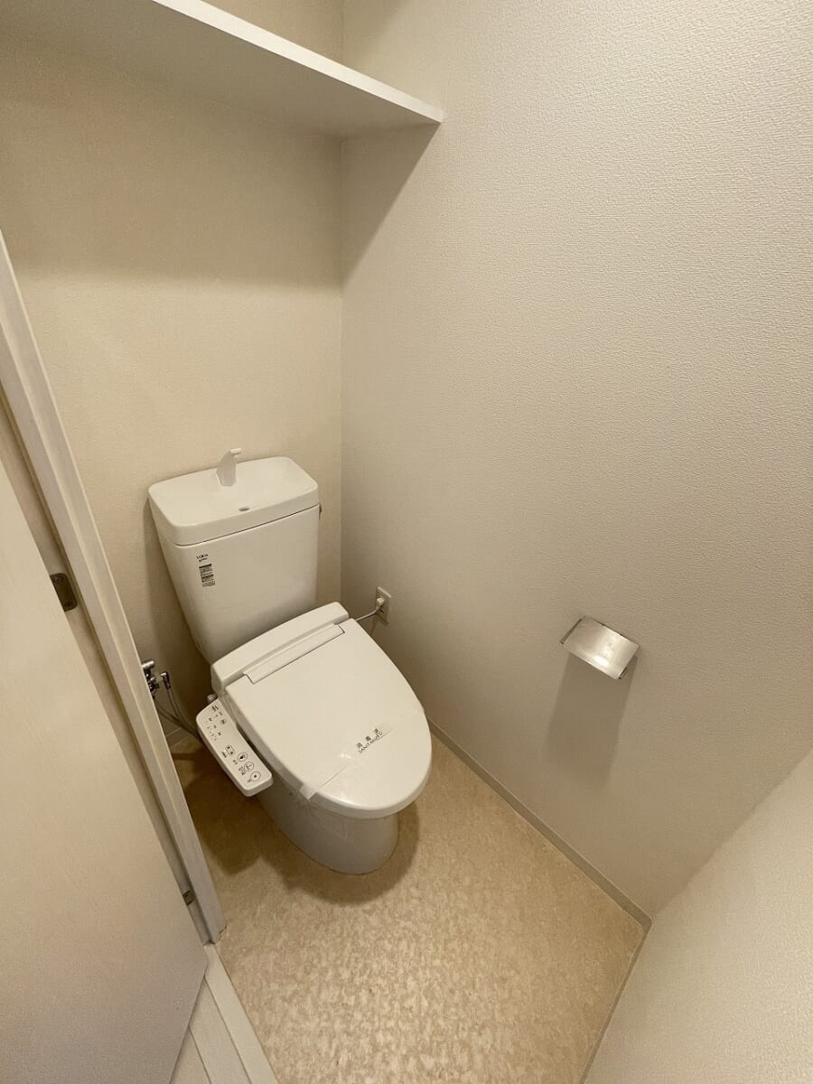 独立タイプのトイレは、温水洗浄便座付きで機能性も高く、白基調で清潔感のある快適な空間に仕上がっています。シンプルでありながらも生活に欠かせない設備がしっかり整っており、来客時にも安心です。