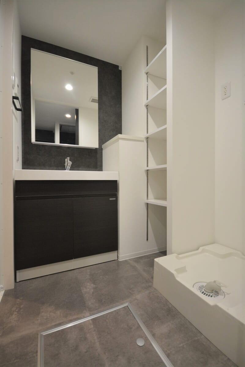 脱衣室には独立洗面台が設置されており、朝の身支度や洗顔、スキンケアも快適に行えます。洗面台のすぐ隣には洗濯機置き場が配置され、家事動線もスムーズ。さらに洗面台と洗濯機置き場の間には収納棚を完備しているため、タオルや洗剤、日用品などを整理整頓しやすく、毎日の洗濯や身支度が効率的に行えます。清潔感のある空間デザインで、築浅物件ならではのおしゃれさも感じられる脱衣室です。