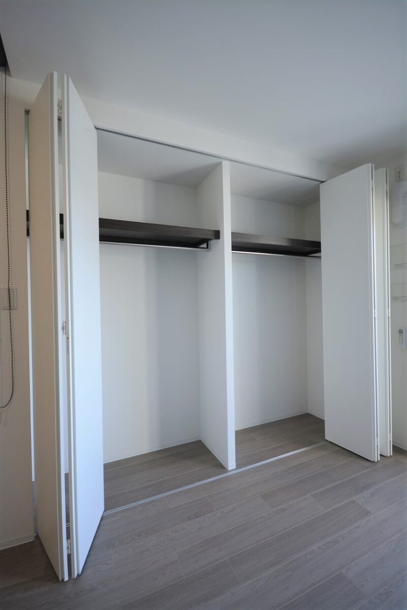 クローゼットは一人暮らしにも二人暮らしにも十分な広さがあり、衣類だけでなく、季節ものの寝具やスーツケース、家電などもまとめて収納可能で、ラックやハンガーパイプも設置されているため、衣類の管理もラクラクです。シーズンごとの衣替えもスムーズで、物の出し入れもストレスがありません。