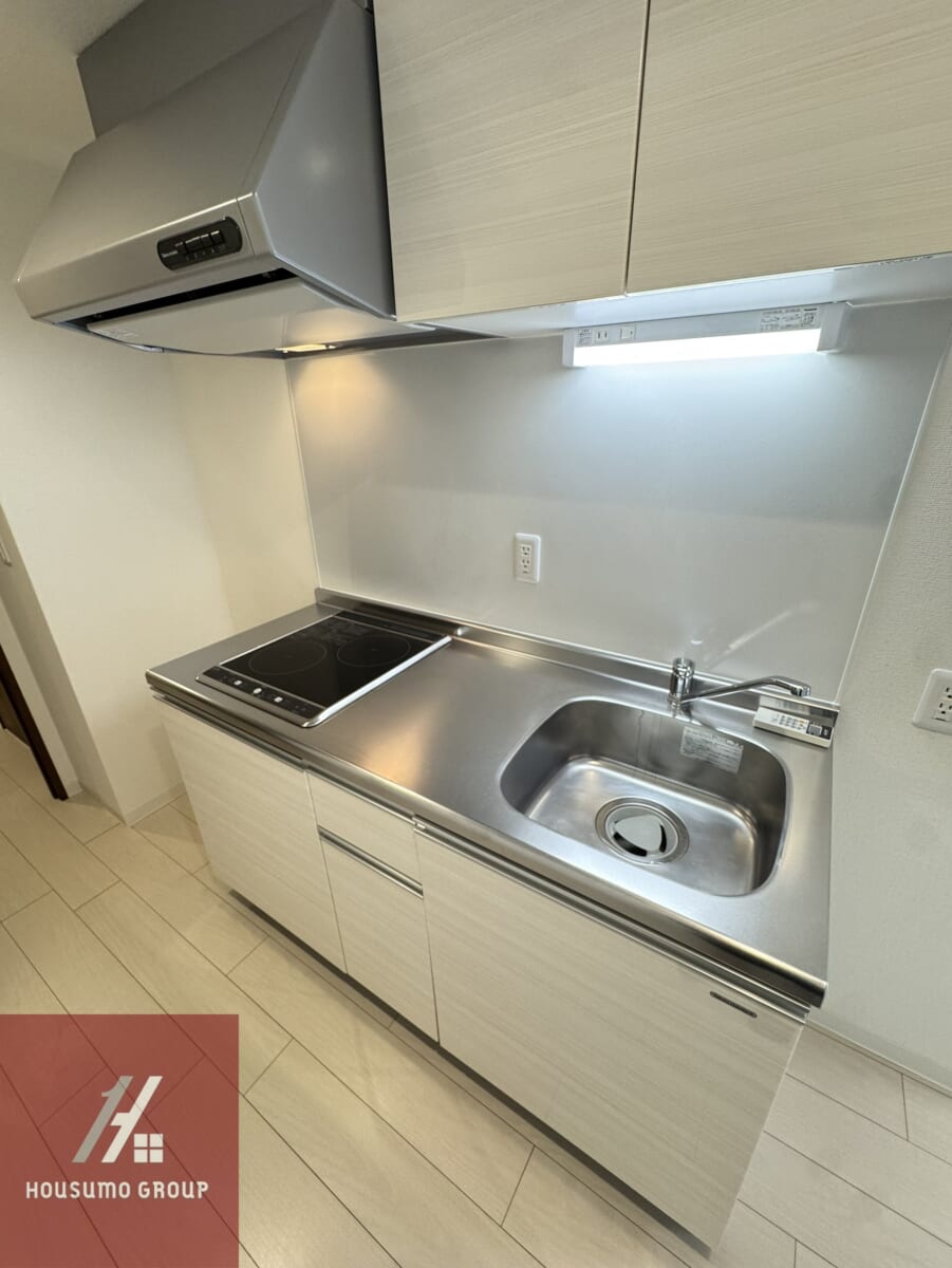 キッチンは対面式ではありませんが、冷蔵庫や家電スペースもゆとりのある設計。2口IHコンロ完備で、調理スペースも確保されており、自炊派の方にも嬉しい環境です。上下に収納スペースがあり、食器や調理器具を整理しやすく、作業効率が上がります。キッチン周りはお掃除も簡単で、常に清潔な状態を保てます。