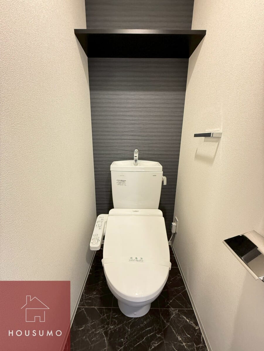 独立タイプのトイレは、温水洗浄便座付きで機能性も高く、清潔感のある快適な空間に仕上がっています。シンプルでありながらも生活に欠かせない設備がしっかり整っており、来客時にも安心です。ブラックのアクセントウォールが落ち着いた雰囲気で日常のちょっとした時間も快適に過ごせます。