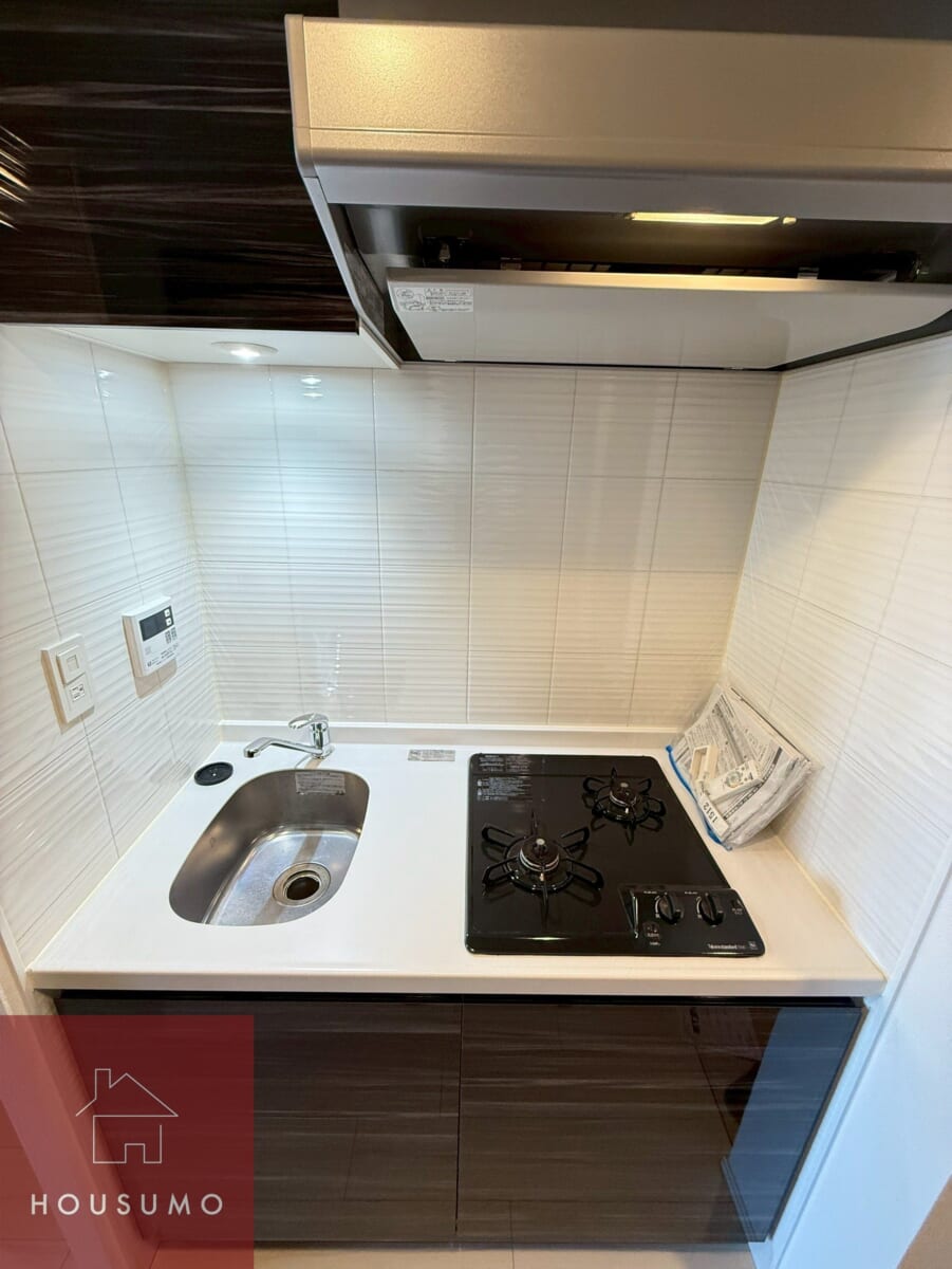 キッチンはコンパクトながら使い勝手を重視した設計で、2口ガスコンロを完備。調理スペースも確保されており、自炊派の方にも嬉しい環境です。上下に収納スペースがあり、食器や調理器具を整理しやすく、作業効率が上がります。キッチン周りはお掃除も簡単で、常に清潔な状態を保てます。