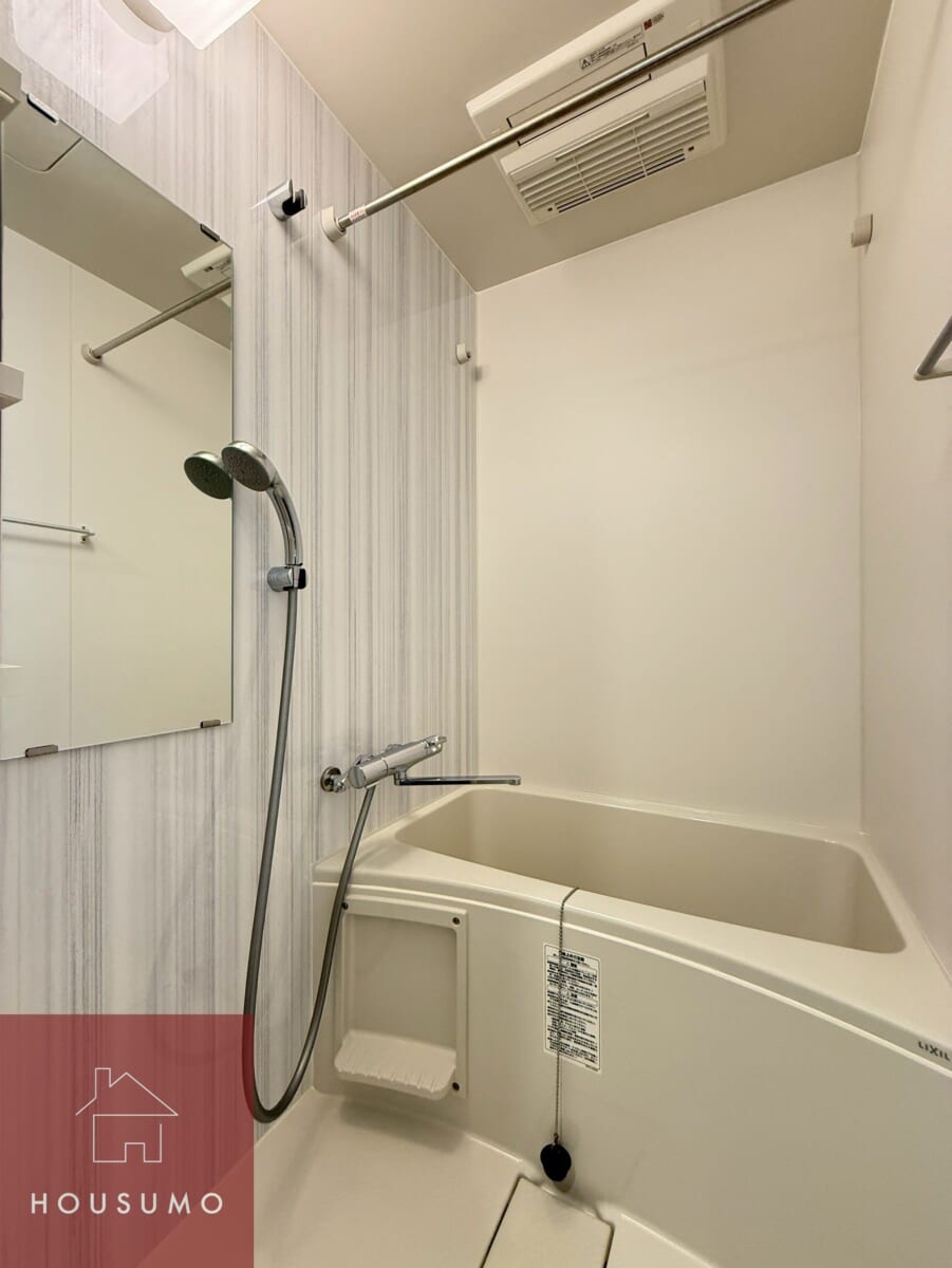 浴室は清潔感のあるホワイトと淡いブルーの配色で、毎日のバスタイムがリラックスできる空間です。乾燥機能を搭載しており、雨の日や夜間でも洗濯物をしっかり乾かすことが可能。湿気やカビ対策にもなるため、清潔感を維持しやすいのも魅力です。追い焚き機能などはありませんが、シンプルで使いやすく、掃除もしやすい作りになっています。