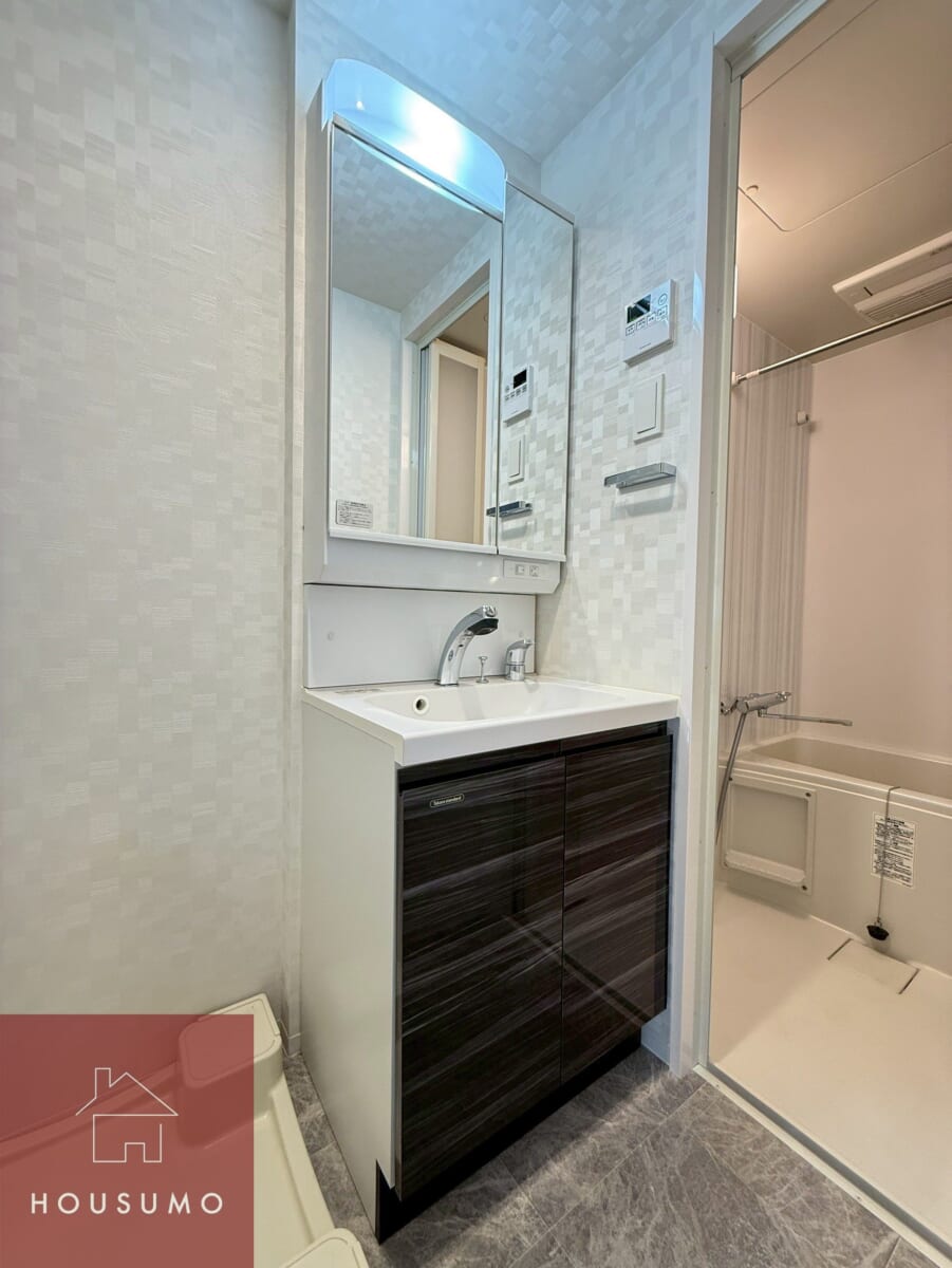 脱衣室には独立洗面台を完備されているので、朝の身支度や帰宅後の手洗い、夜のスキンケアタイムまで、使い勝手がよくストレスのない設計です。鏡裏収納付きですっきりとした清潔感ある見た目に◎脱衣室がしっかりと区切られているので、来客時のプライバシーもしっかりと確保できます。