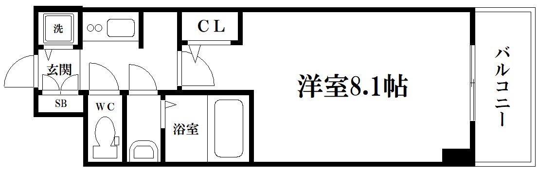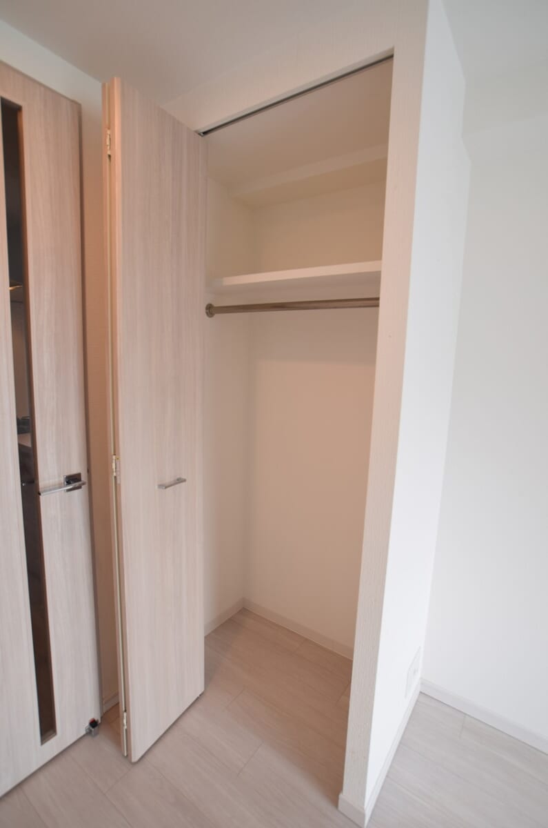 洋室の一角には、コンパクトですが高さのあるクローゼットを設置されており、ハンガー収納と棚スペースがバランス良く配置されているため、衣類だけでなく季節家電やスーツケースの収納にも便利です。荷物を“見せない収納”にできるので、広めの8.1畳を縦にも横にも有効に使え、室内の印象がすっきり整います◎