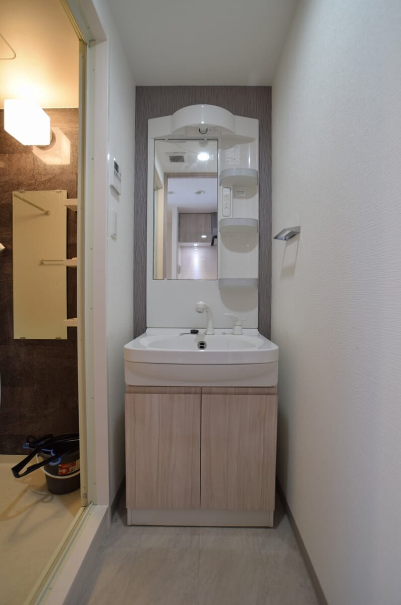 脱衣室には、使い勝手の良い独立洗面台がしっかりと備え付けられており、朝の身支度から夜のスキンケアまで快適にこなせます。また、玄関すぐの位置にある洗濯機置き場には“扉が付いている”のが大きな魅力。生活感が出やすい洗濯機を視界からさっと隠せるため、帰宅時の印象がとてもスマートになります。急な来客があっても、扉を閉めるだけで空間の見映えが整い、一人暮らしとは思えない上品な生活導線に◎