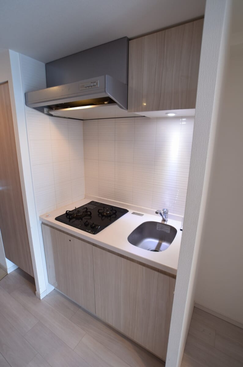 キッチンはコンパクトながら使い勝手を重視した設計で、2口ガスコンロを完備。調理スペースはコンパクトですが、同時調理が可能なので、自炊派の方にも嬉しい環境です。上下に収納スペースがあり、食器や調理器具を整理しやすく、作業効率が上がります。忙しい転勤者の方でも、シンプルな動線でスムーズに料理ができる工夫が施されています◎