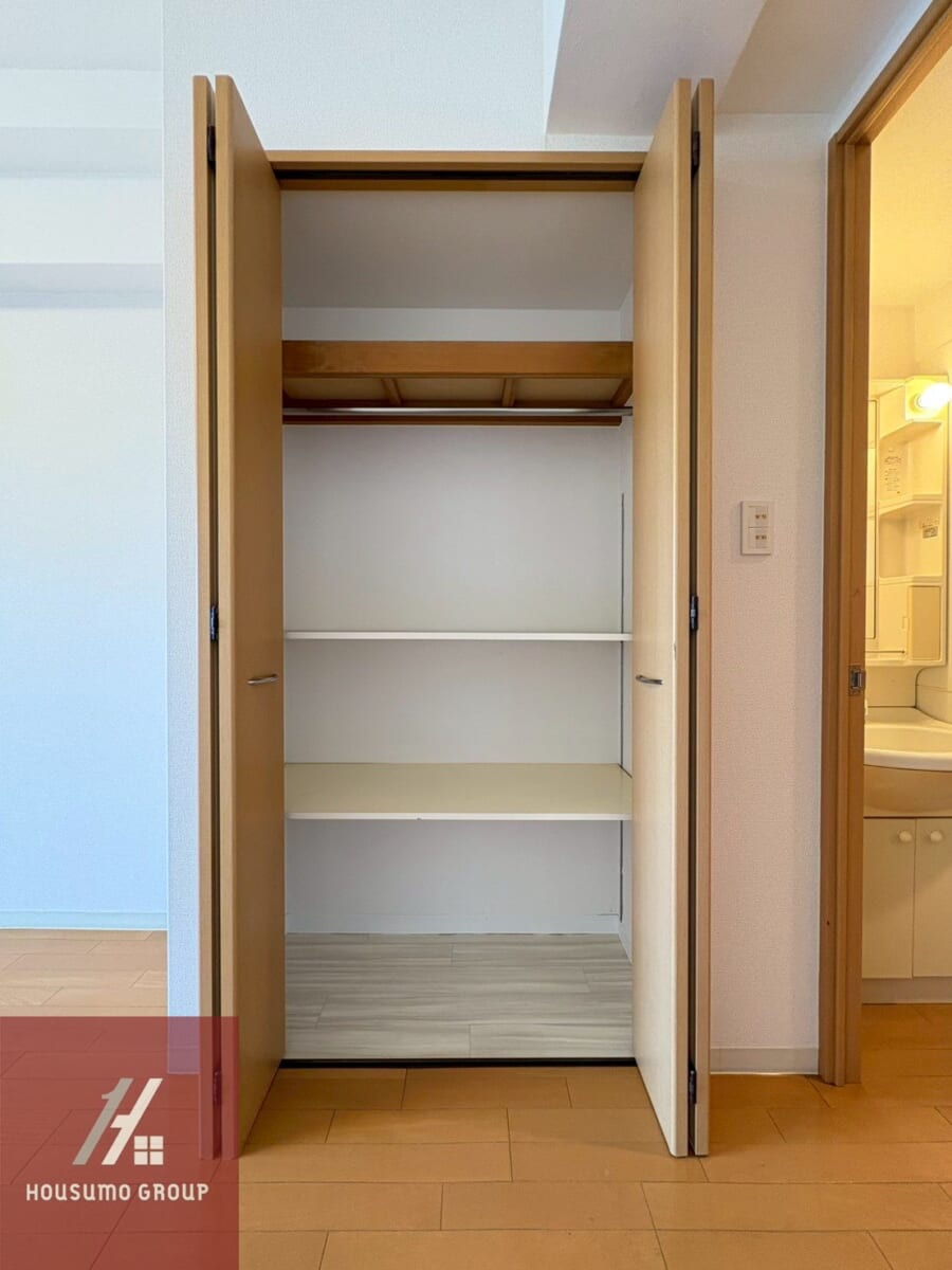 クローゼットは“奥行き”にゆとりがあるのがポイントです。幅自体は大きくないため大容量というわけではありませんが、高さもあるので、奥行きを活かして衣類の前後収納や、衣装ケースなども収めやすい構造で、見た目以上の収納力があります。また、ハンガーラックもあるので、丈の長いコートやシャツ類もしわなく収納することができます◎