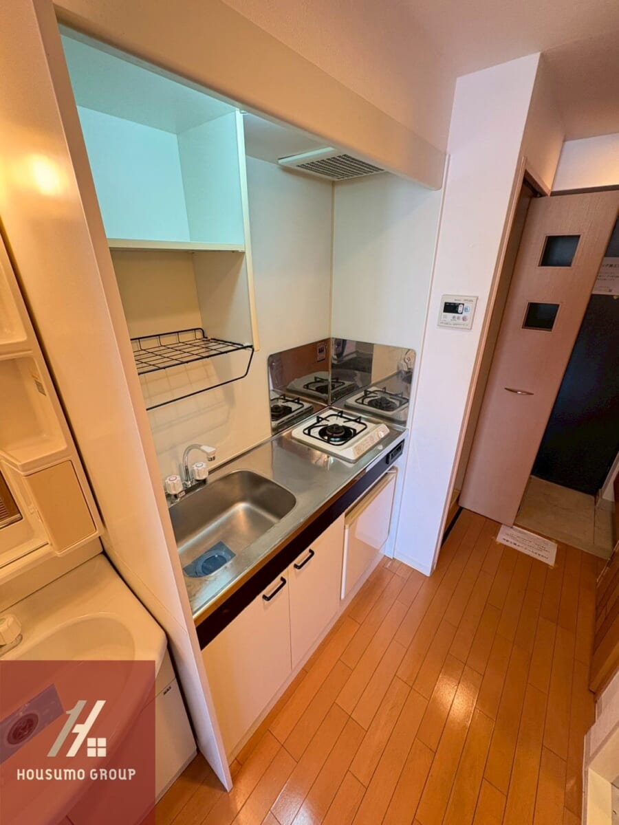 脱衣室は設けられていませんが、キッチン横に独立洗面台が配置されています。動線が短く、朝の身支度や帰宅後の手洗いがスムーズに行える位置関係が魅力で、脱衣室がない分スペースがすっきりしており、キッチンまわりに自然と生活の中心がまとまるため、一人暮らしには使い勝手の良いレイアウトです◎