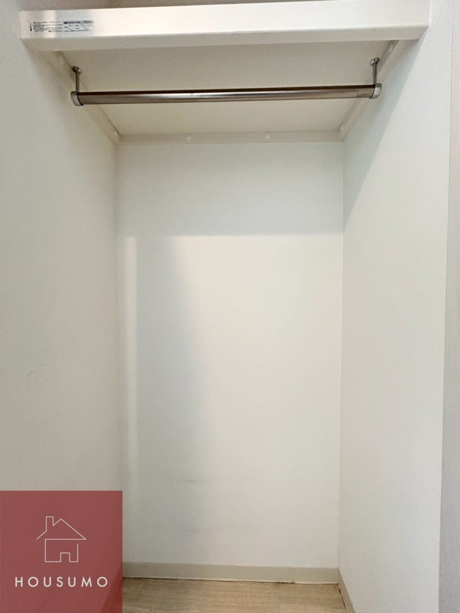 クローゼットは“奥行き”にゆとりがあるのがポイントです。幅自体は大きくないため大容量というわけではありませんが、高さもあるので、奥行きを活かして衣類の前後収納や、衣装ケースなども収めやすい構造で、見た目以上の収納力があります。また、ハンガーラックもあるので、丈の長いコートやシャツ類もしわなく収納することができます。