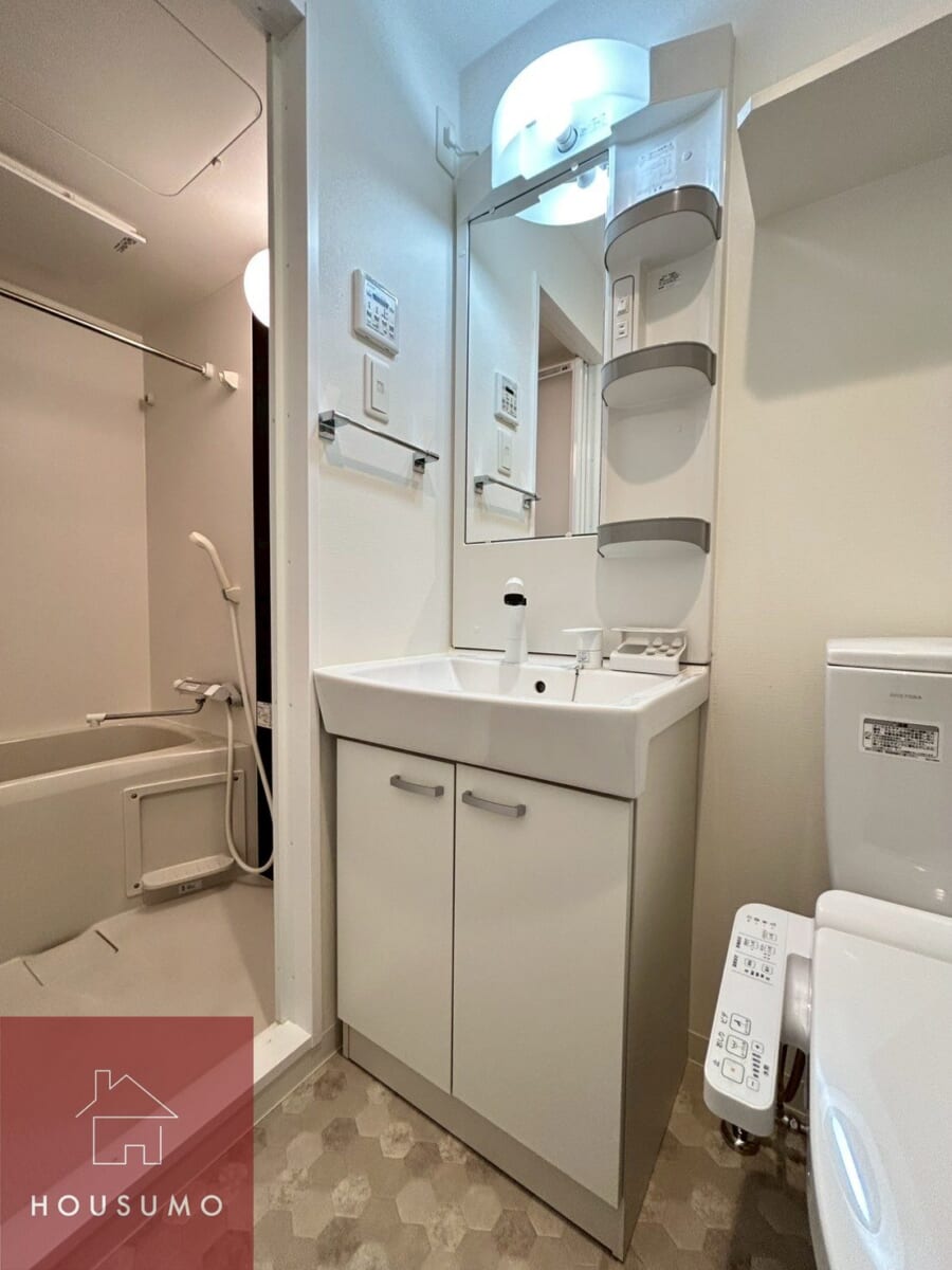 脱衣室はトイレと独立洗面台が並ぶ設計で、生活動線が非常にスムーズです。朝の準備や洗顔、歯磨き、トイレ利用まで一連の動作を無理なく行えるため、忙しい転勤者や単身者の方に特に便利です。独立洗面台は清潔感のあるデザインで、身支度の際も快適に使えます。また、洗面台周りには小物を置けるスペースが確保されており、化粧品や歯ブラシ、タオルなども整理しやすく、生活感を抑えながら整頓できます。