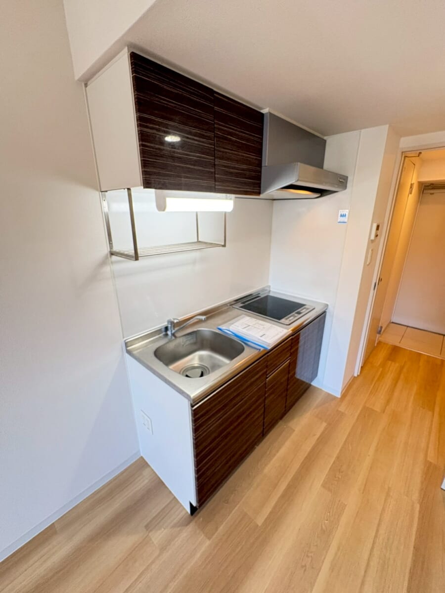 キッチンはコンパクトながら使い勝手を重視した設計で、2口IHコンロを完備。調理スペースも確保されており、同時調理が可能なので、自炊派の方にも嬉しい環境です。上下に収納スペースがあり、食器や調理器具を整理しやすく、作業効率が上がります。忙しいビジネスマンの方でも、シンプルな動線でスムーズに料理ができる工夫が施されています。