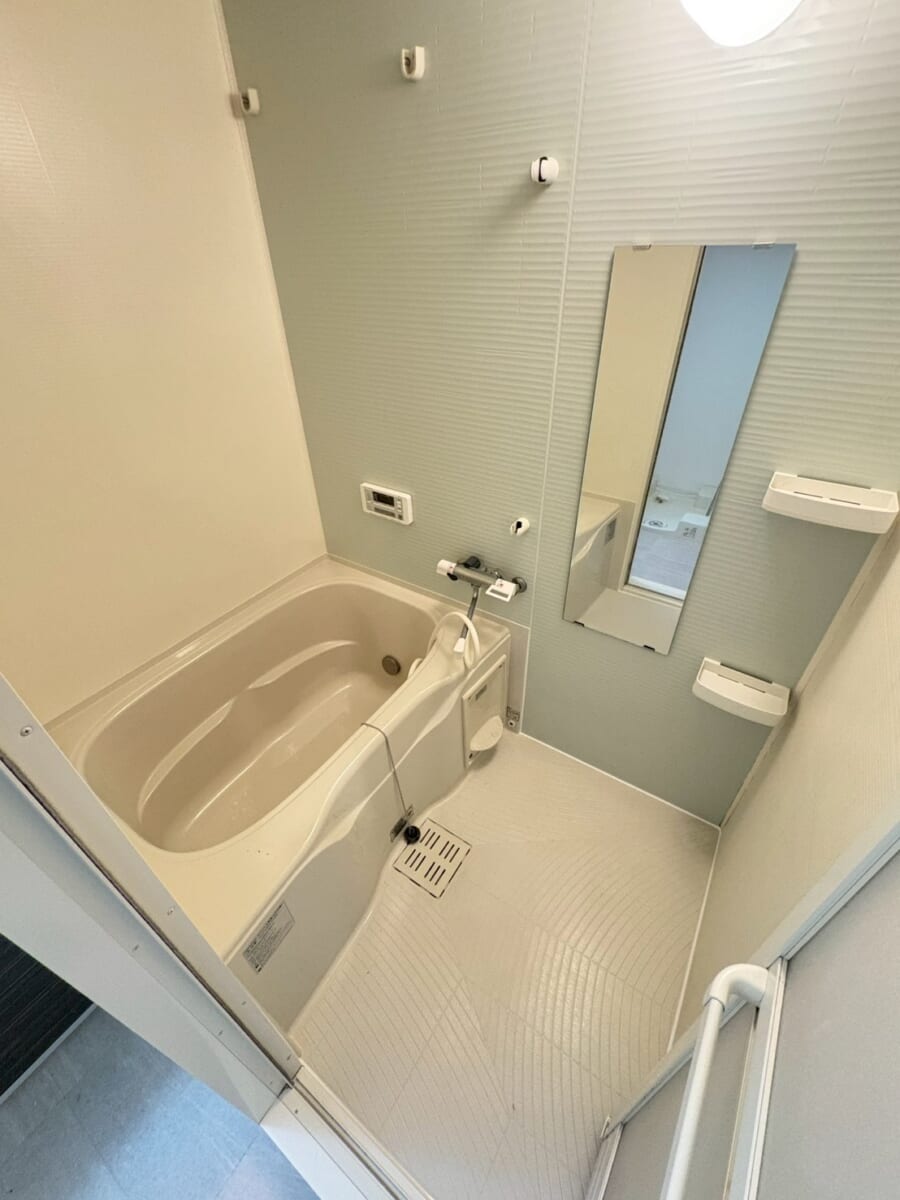 バスルームはシンプルで無駄のない造りになっており、毎日の入浴を快適にサポートしてくれます。掃除もしやすく、清潔感を保ちやすい点が魅力。浴槽は一人暮らしにちょうど良いサイズ感で、肩までしっかり浸かれるため、日々の疲れを癒すリラックスタイムを確保できます。シンプルだからこそ、バスグッズや小物で自分好みの空間にアレンジしやすいのもポイントです◎