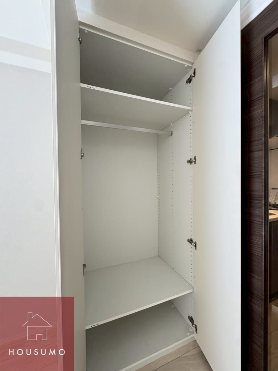 洋室に設置されたクローゼットはコンパクトですが、ハンガーラッグ付きで、丈の長いコートやシャツ類はしわなくかけることができます。入りきらないオフシーズンの衣類はボックス収納やベッド下収納などで補うのがおすすめです。限られたスペースを有効活用することで、スッキリとした暮らしが実現します。