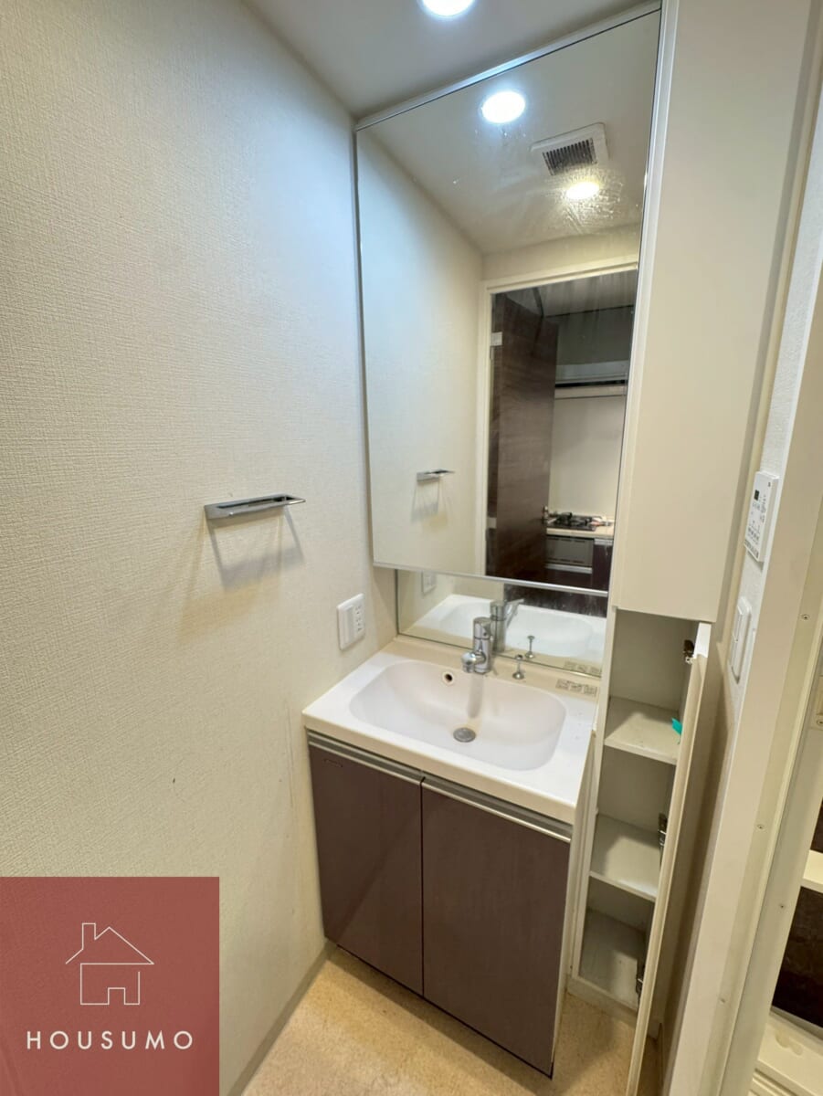 脱衣室には独立洗面台が設けられており、朝の支度や帰宅後の身だしなみを整える時間が快適に。鏡裏収納がしっかり確保されているため、スキンケア用品やヘアセット道具、日常的に使う小物類をすっきりと隠して置けます。洗面台周りに物が出っぱなしにならないので、毎日使う場所なのに自然と清潔感がキープできる点が魅力です。生活感を抑えつつ“自分のための身支度スペース”をつくりたい方にぴったりの仕様です◎