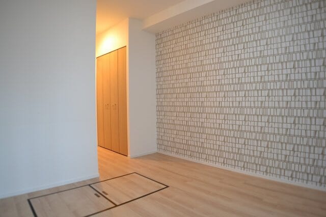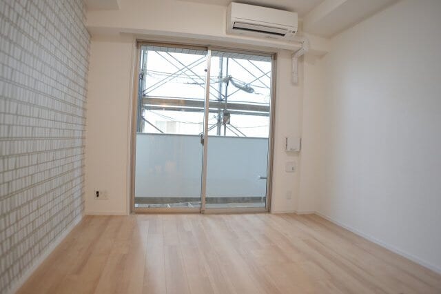 洋室は、ナチュラルな色合いのフローリングと清潔感のある白壁が、明るく心地よい住空間を創り出しています。バルコニーに面した大きな窓からは自然光がたっぷりと差し込み、日中は照明をつけなくても穏やかな明るさの中で過ごすことが可能です。壁一面には幾何学模様のスタイリッシュなアクセントクロスが施されており、シンプルながらも個性が光る洗練されたインテリアを楽しめます。室内にはエアコンが標準装備されているため、引っ越した直後から季節を問わず自分好みの快適な温度でリラックスタイムを過ごせるのが大きな魅力です。