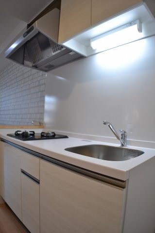 キッチンは、明るい木目調のデザインが空間を華やかに彩る、清潔感あふれるシステムキッチンが採用されています。二口のガスコンロが完備されているため、メイン料理と汁物を同時に調理するなど、忙しい毎日でも手際よく自炊を楽しむことが可能です。作業スペースの上部には手元を明るく照らす照明や、調理器具をすっきりと整理できる収納棚が備わっており、機能性も十分に考慮されています。シンク周りも使い勝手の良い広さが確保されており、お料理の後片付けもスムーズに行えるため、常に綺麗な状態をキープしやすいスマートな設計となっています。