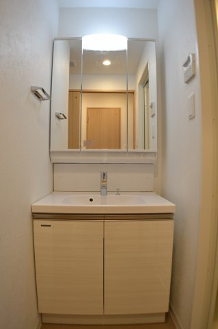 洗面脱衣所には、身支度に便利な三面鏡付きのシャンプードレッサーが完備されており、鏡の裏に散らかりがちな小物をすっきりと収納できるのが魅力です。木目調のパネルが上品な洗面台は、脱衣スペース全体の明るく清潔感のある雰囲気と見事に調和しています。室内洗濯機置き場もこのスペースに確保されており、入浴時の脱衣から洗濯までの流れをスムーズに行える効率的な動線が実現されています。白を基調とした壁面に囲まれた明るい空間は、朝の慌ただしい時間でも気持ちよく準備を整えることができる、機能美に優れた設計となっています。
