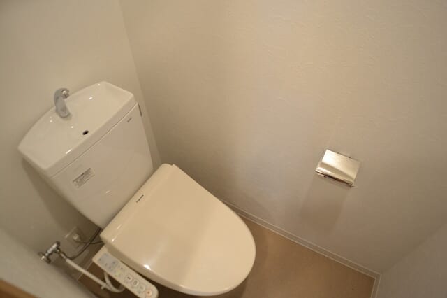 お手洗いは、白を基調とした清潔感あふれる空間に、毎日の生活に欠かせない温水洗浄便座が完備されています。手洗い付きのタンクが採用されているため、使用後すぐに手を済ませることができ、限られたスペースを有効に活用した設計が魅力です。壁面にはスタイリッシュなシルバーのペーパーホルダーが備わり、シンプルながらも洗練された都会的な印象を与えてくれます。機能美と清潔感を両立させたこの場所は、プライベートな時間を心地よく過ごすための配慮が行き届いています。
