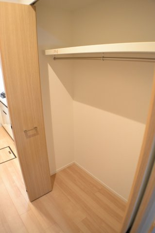洋室の壁一面には、天井までの高さを活かした大容量のクローゼットが完備されており、衣類から季節物までたっぷりと収納できるのが大きな魅力です。木目調の扉がナチュラルな内装に溶け込み、閉めるだけでお部屋を常に美しく、広々とした状態に保つことができます。また、廊下部分には可動棚を備えた物入も設置されており、日用品のストックや掃除用具など、生活感の出やすいアイテムをスマートに隠して収納可能です。さらに、洗濯機置き場の上部にも棚が設けられているため、洗剤やネットなどを手の届く場所に整理でき、家事の効率をさりげなくサポートしてくれる設計となっています。