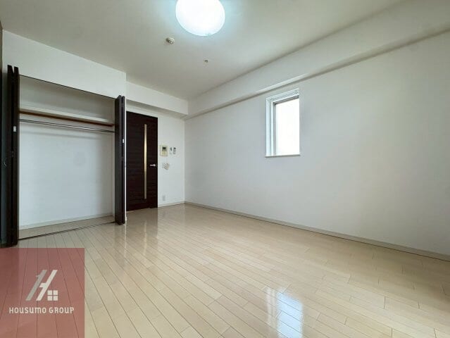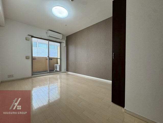 7.9帖の広々とした洋室は、バルコニーに面した大きな窓と小窓の二面から光が入り、明るく開放的な空間です。壁の一部には落ち着いた色合いのアクセントクロスが施されており、シンプルながらも洗練された都会的な印象を与えます。エアコンや照明器具が標準装備されているため、入居したその日から快適な生活をスタートできるのが嬉しいポイントです。フローリング仕様のフラットな室内は、ベッドやデスクなどの家具を自由にレイアウトしやすく、自分好みの快適なお部屋作りを楽しめます。