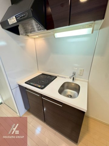 キッチンは、二口のIHコンロを搭載したオール電化仕様のシステムキッチンです。コンパクトながらもお手入れがしやすいワークトップを採用しており、日々の調理を効率よくスムーズに行える設計が魅力です。シンク上部と下部には、調理器具や食器類を分類して収納できるスペースが確保されており、限られた空間を有効に活用できます。ダークブラウンのシックなパネルデザインは、廊下からお部屋全体の雰囲気をスタイリッシュに引き締め、都会的な一人暮らしにぴったりの機能美を備えています。