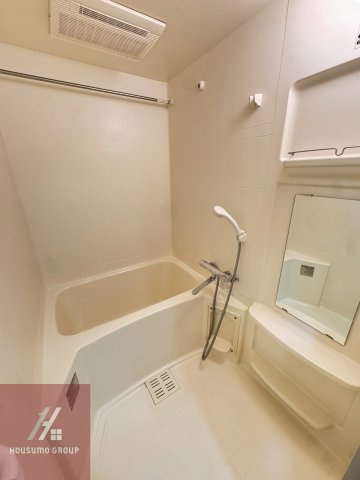 バスルームは、清潔感のあるホワイトで統一された、明るく爽やかな空間です。浴室乾燥機が完備されているため、天候に左右されず洗濯物を干すことができ、忙しい都会での生活を賢くサポートしてくれます。シャワーヘッドの高さ調節が可能なスライドバーや、シャンプーなどを置ける便利な棚など、使い勝手を考慮した設備が充実しています。ゆったりとした浴槽に浸かって一日の疲れをリセットできる、リラックスしたバスタイムを提供してくれるお部屋です。