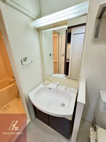 脱衣所には、忙しい朝の身支度を快適にサポートする、明るい照明付きの独立洗面化粧台が完備されています。洗面ボウルは使い勝手の良い広々とした設計で、下部にはお掃除用品や日用品をすっきりと収納できるスペースが確保されています。洗面台の横にはタオル掛けも設置されており、入浴時の動線を考慮した機能的なレイアウトが魅力です。室内洗濯機置き場も同じ空間に配置されているため、脱衣から洗濯までをスムーズに行える、家事効率に優れた設計のお部屋です。