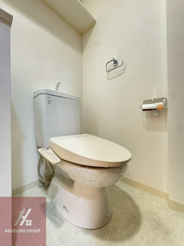 トイレには温水洗浄便座が完備されており、日々の生活を衛生的かつ快適にサポートしてくれます。背面の壁にはちょっとした小物を置ける棚が設置されており、トイレットペーパーのストックなどを機能的に収納することが可能です。白を基調とした清潔感のある空間に、タオル掛けなどの細かな設備も整っており、使い勝手の良さが光ります。独立した個室タイプのためプライバシーも確保されており、落ち着いて利用できる心地よい空間に仕上がっています。