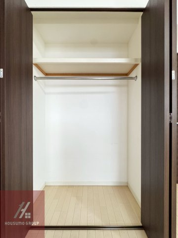 お部屋の収納は、洋室に設けられた大型のウォークインクローゼットが最大の魅力で、衣類だけでなく大きな荷物もまとめて保管できるゆとりがあります。内部にはハンガーパイプと上部棚が設置されており、丈の長いコートから小物類まで効率よく整理整頓することが可能です。玄関には天井近くまで高さのあるシューズボックスが完備されており、散らかりがちな靴をすっきりと収納してお客様を気持ちよく迎えられます。居住スペースを最大限に広く使えるよう各所に機能的な収納が配置されており、荷物の多い方やファッション好きの方にもご満足いただける設計です。